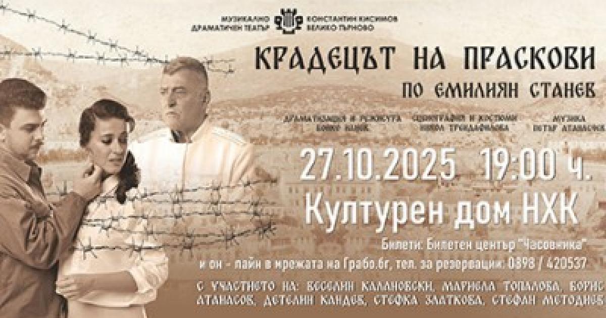 Веселин Калановски и Мариела Топалова ще бъдат Иво Обретенович и Елесивета в спектакъла" Крадецът на праскови", по едноименната повест на Емилиян Станев. Той ще бъде представен на сцената на Културен дом НХК на 27 октомври
