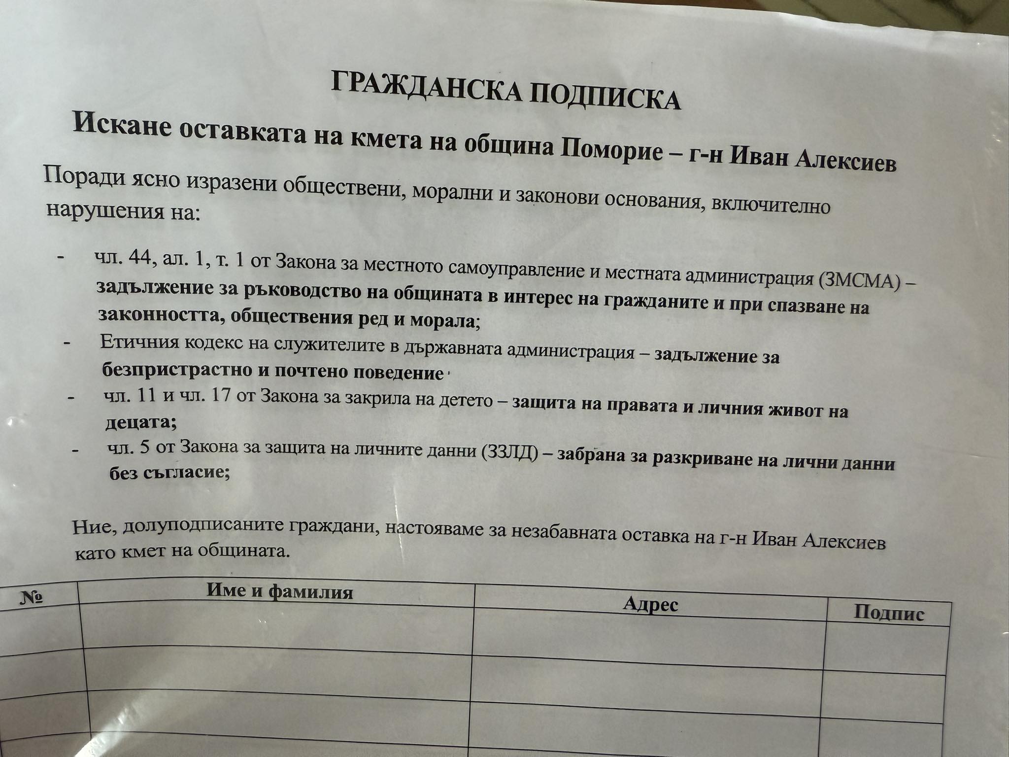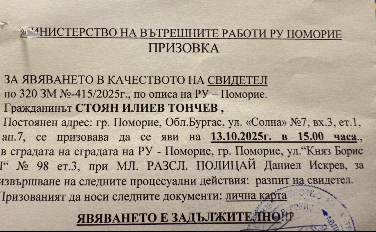 След вчерашния протест в защита на децата, провел се в Бургас и в Поморие, на който присъствах и бе поискана оставката на кмета на община Поморие Иван Алексиев, като започна и подписка за това, днес /неделя/ ми бе връчена призовка за явяването ми утре /понеделник/ като свидетел по заявителски материал в РУ-Поморие.
