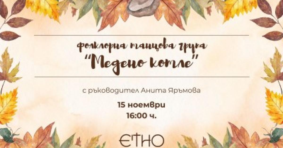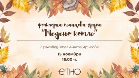 За да бъде съботният ден още по-празничен и цветен, сцената на Етно кафене и музей ще посрещне таланти и на 15 ноември. В почивния ден, от 16:00 часа, не пропускайте концерта на Фолклорна танцова група "Медено котле" с ръководител Анита Яръмова. Събитието ще се проведе при вход свободен
